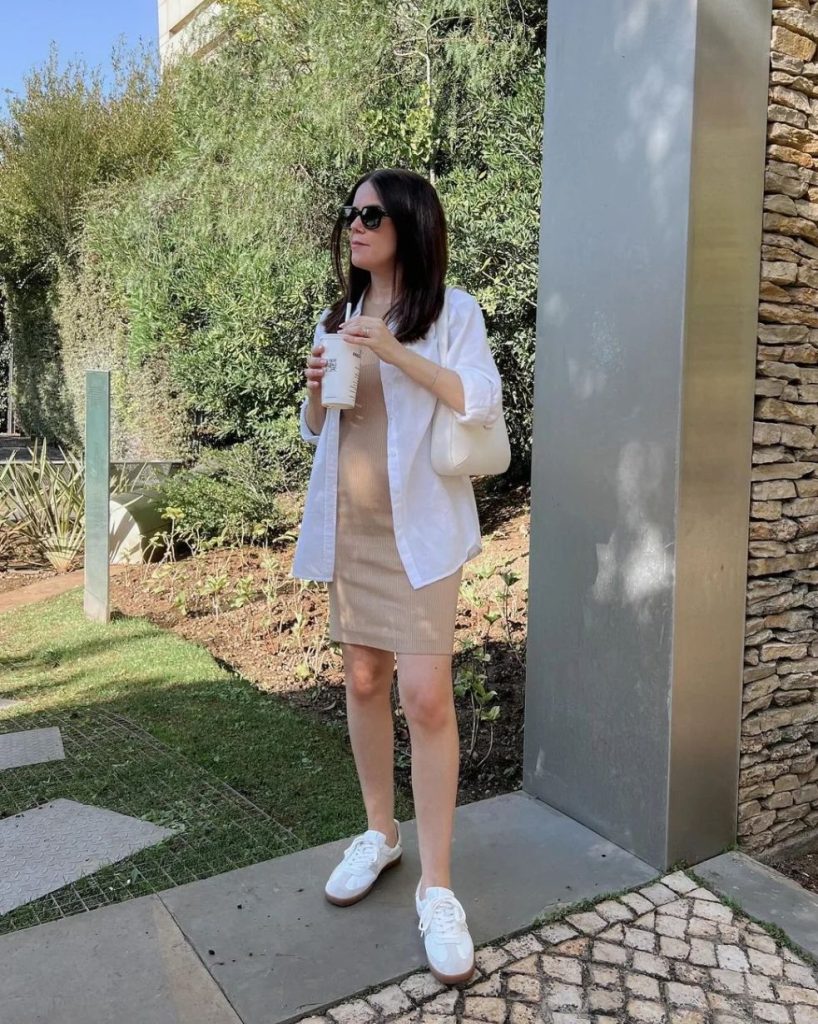 Here am wearing subtle nude dress styled with white cotton shirt matching with my white comfortable shoes and purse and of course a style statement sunglass is essential.